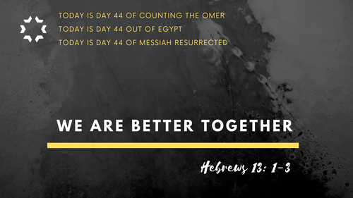 We may not always know what God has for our individual next steps but we do know that His word gives us guidance and direction. During this 50 days of fasting and prayer, Hebrews 13 is an excellent summary of how to live in light of Yeshua’s coming. Love one another... Show hospitality to strangers... Remember prisoners.... Reject sinful behavior... We should be observing each one of these precepts with all of our heart, soul, and strength. When we do this, God will unify us in a special way. He will show us that we were created to be one body, a people who were created to fellowship with Him and with each other. When we worship, laugh, cry, pray, eat, and essentially just live life together, God will faithfully bring us victory in every area of our lives and meet our every need. He will empower us to cross the threshold of what He has for us all, and we will lead others to know Him in powerful, life changing ways. This is what being better together is all about!